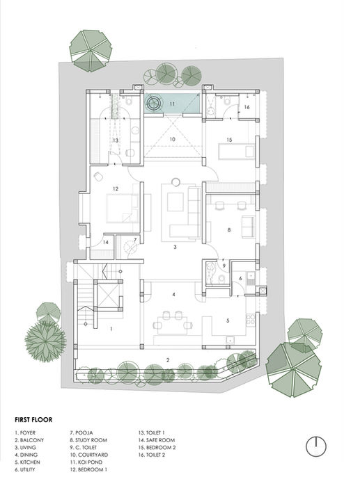 The common spaces—living and dining—are arranged linearly to enhance flow and connectivity, bathed in natural light from a rear courtyard and a front balcony. The courtyard features a koi pond with a small water wall fountain, creating a tranquil oasis that connects the indoors with nature. Other spaces include kitchen adjoining uiltity, 2 bedrooms and a study/ recreation room. There is also an additional guest room that extends to outdoors on the terrace. This layout ensures a perfect balance of light, ventilation, and privacy.