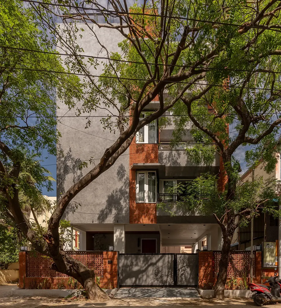 We took the project with the older house constructed on the land. It was a single storey home in a typical south Indian setting. Post the demolition, we materialised the clients requirements and now Kaarai Kudil as we call it is now a stilt + three story corner building with a north east entrance.
