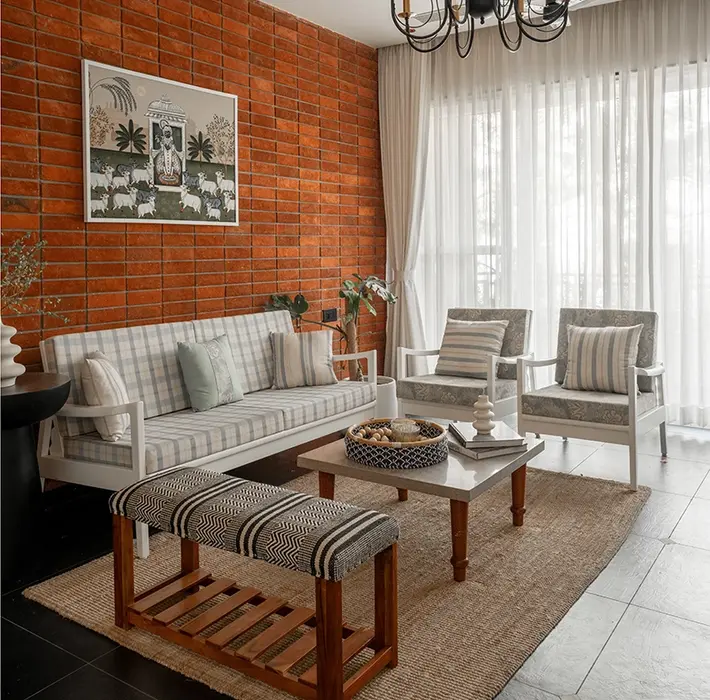 The material palette of the home is kept very warm and rustic. Textured concrete and brick are one of the prime materials and used throughout the house including the facade. Different flooring materials like Athangudi, black granite, Kota, patterned ceramic tiles are used. A lot of deep reds, burnt orange, greys are used to compliment the interiors.